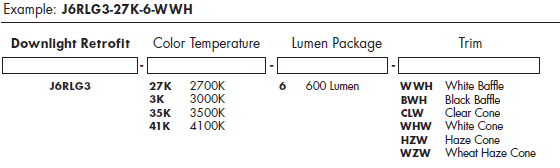 The J6RLG3 retrofit module is compatible with most 6" recessed housings measuring at least 5-1/4" high with an inside diameter between 6" and 6-3/4". Removal of the housing socket plate or socket mounting bracket may be required in order for the trim to fit properly. If housing does not have torsion spring brackets, the V6RL-TRB accessory is required. Compatible housings include, but not limited to: Juno housings: IC2 and TC2 Series, IC22 Series, IC23 Series, IC21 Series